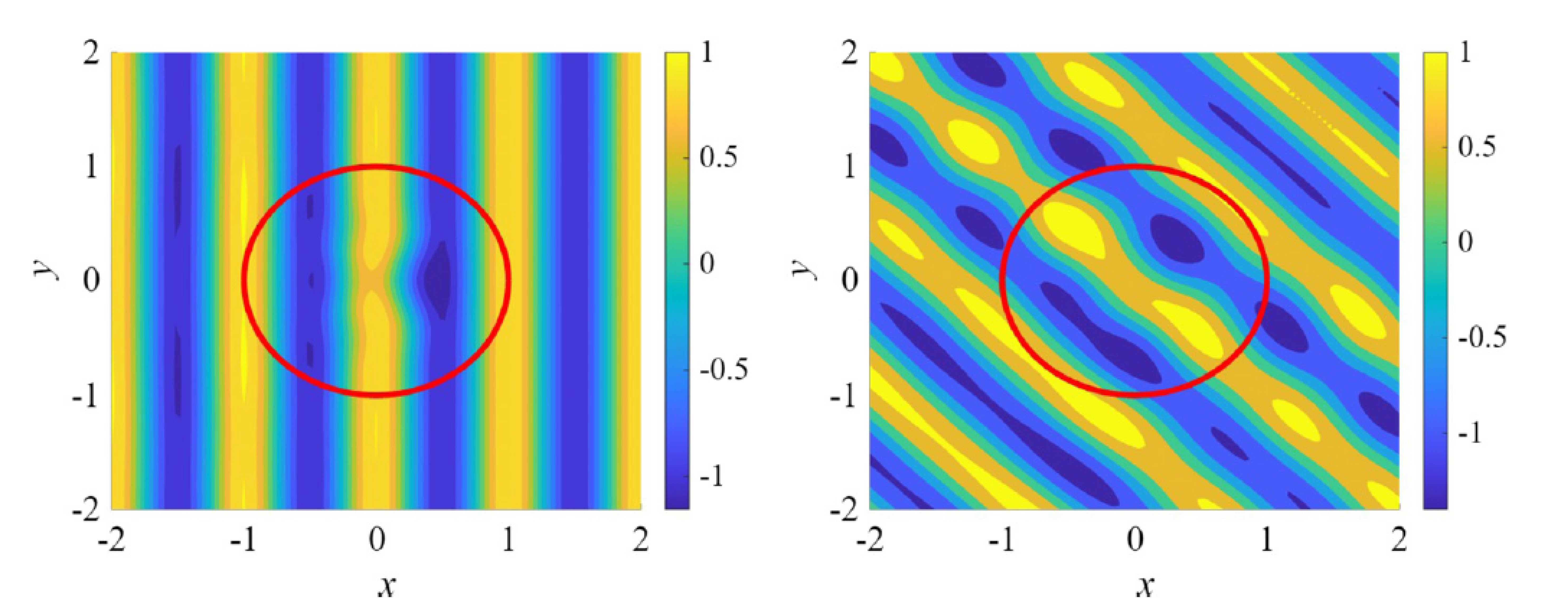 A simulation of light hitting from an invisibility direction and a non-invisibility direction, taken from our paper, is shown below. In the left image, a wave is illuminating the object from the left, and one can see that it passes through the object (outlined with a red circle) with no distortion. The field is distorted within the object, but when it leaves it is as if it never encountered it in the first place. In the right image, a wave comes in at an angle from a non-invisibility direction, and it is significantly distorted all around the object.