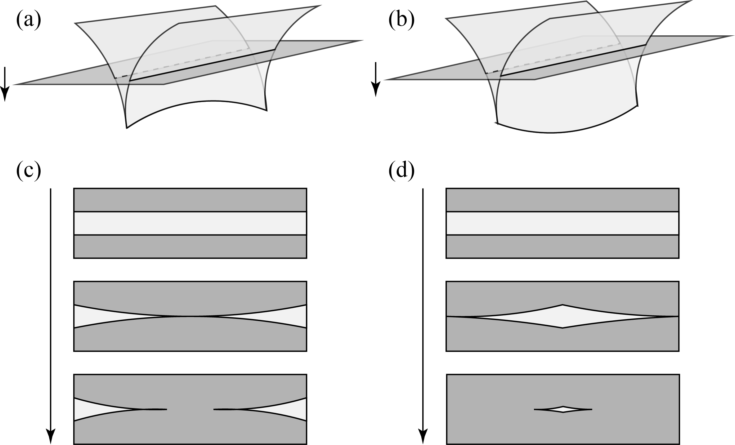 Now let’s imagine what we see on the screen as we change the height of our observation screen, in particular moving it downwards. Parts (c) and (d) shown the results for the two cases. In (c), we start with two parallel fold caustics bounding a bright region. As the screen moves down, the bright region appears to pinch together as the screen approaches the upward curved cusp line, and then eventually breaks into two observed cusps. For (d), as the screen moves down, the middle of the downward curved cusp line is the last to disappear, and we will see two cusps come together and vanish.