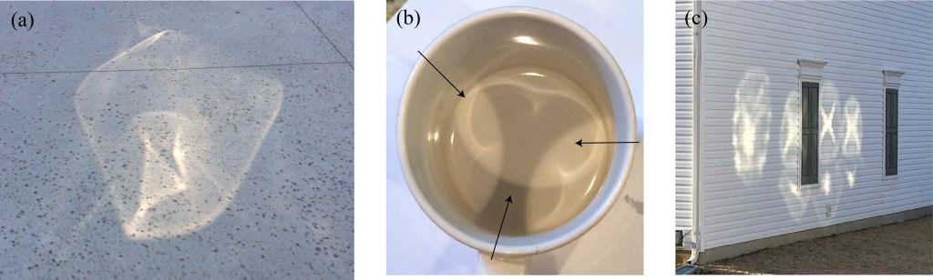 The first image was a spot of light I saw on the ground at Gaffney Outlet Mall, created by light passing through some sort of decorative glass feature. The second image shows a coffee cup with three bright images inside, one for each light source illuminating the cup (the arrows show the direction the light is traveling). The third image shows spots on the side of a building in my neighborhood, created by light reflecting off of warped windows of a neighboring building.