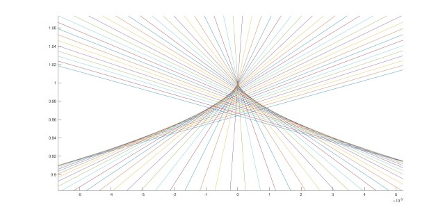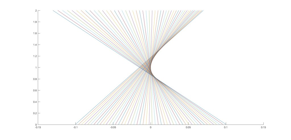 With this in mind, it should be noted that we wouldn’t be able to observe the cusp if we simply put a horizontal screen in front of the rays in the picture above, because the caustic in this picture is derived as a vertical slice. However, if we tilt the horizontal screen, we would essentially take a different slice through the figure, allowing us to see the folds and cusps clearly.