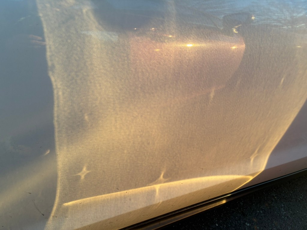 Once you start recognizing these caustic features, you will see them everywhere. The other day I was getting out of my car and my open door reflected the setting sun onto the car next to mine. I had to stop and take a photo of how the small dings and dents in my car created caustic patterns.