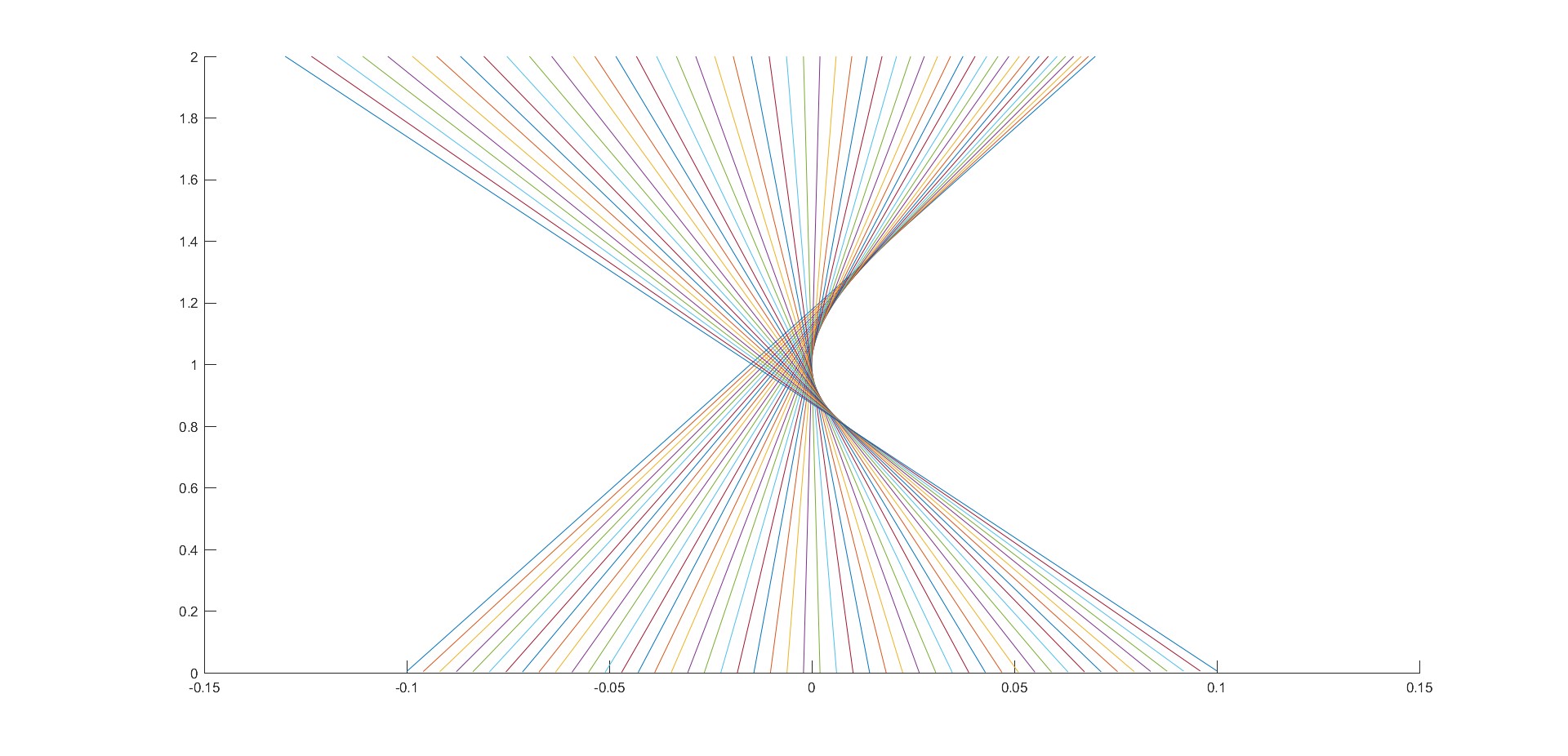What is happening here? The rays are all coming from the bottom, as in our lens picture. The rays on the right are being focused at too steep an angle, and they cross the center axis too early. The rays on the left are being focused at too shallow an angle, and they cross the center axis too late. You can see a triangular region where there are two rays that pass through every point — this is the “bright area” associated with caustics that we mentioned earlier.