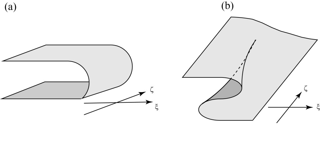 Let’s tie our discussion of caustics back into classic figures of catastrophe theory to see the connection, at least qualitatively. The fold and the cusp catastrophes are usually depicted as surfaces as shown below.