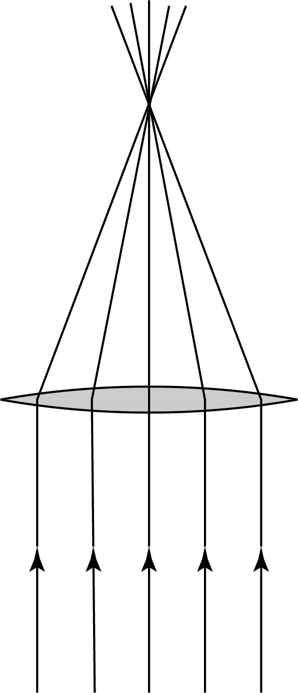 A very collimated beam of light coming in from the bottom — represented by a collection of parallel rays — is focused to a point on the top. Each ray is bent slightly differently by the lens, which has a spatially varying thickness.