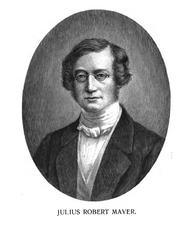 This mechanism was already known by science at the time, but it triggered a train of thought in Mayer that became his obsession. At the time, there was much discussion about the nature of heat: what is it that makes some things warmer than others? The prevailing theory was that heat is its own physical fluid, called caloric, that could be released from a substance by friction or combustion. Also known but less popular was the (correct) theory that heat is simply the collective random motion of atoms and molecules. Heat spreads because some of those “hot” molecules collide with neighboring “cold” molecules and transfer their energy to them. Mayer’s thoughts about the generation of heat by the human body led him not only to consider heat a form of motion, but to postulate that there is a conserved “something,” that he called “force,” that could be used to unify thinking about physical phenomena throughout nature, from simple collisions of inanimate objects to the workings of living creatures.